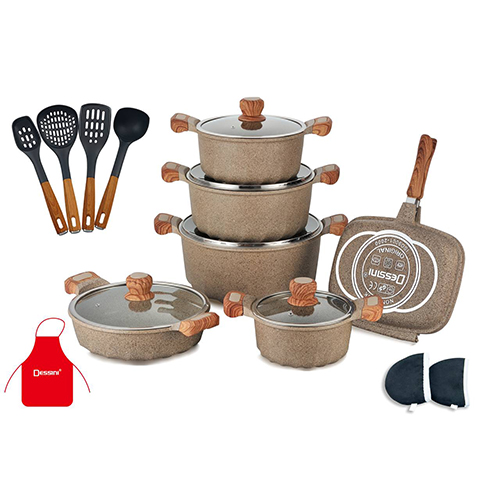 Dessini products are the perfect solution for cooking healthy and dietetic food without fat and very easy to clean. Dessini products are made of high-quality raw material by the expert designer team in various and pleasant styles. Before using the pot for the first time wash in hot soapy water, dry thoroughly, and season lightly with oil/butter. Low/Medium heat is sufficient for obtaining the best cooking results. Never overheat the pot (a maximum temperature of 200-240C is indicated on the packing for each specific range). Cast aluminum is a very good conductor of heat and continual overheating could damage the coating. Do not heat the pot when it’s empty. The pot must be used for cooking only. Do not use the pot for conserving (stocking) the food for longer periods as some aggressive food can damage the coating. Use only wooden and nylon utensils and do not cut the food in the pot. After use leaves the pot to cool for a while, clean it in hot soapy water and dry it thoroughly. Some aggressive detergents can damage the product. Wash by hand is suggested. The slight color change of the coating inside the pot does not have any negative effect on the quality of the product or its effectiveness during use. Bakelite handles and knobs of pots and knobs of the lids are ovenproof from 180-240C (follow induction on the packaging of the product). Dessini products are suitable for all types of cookers (gas, electric, ceramic/halogen hobs, oven)